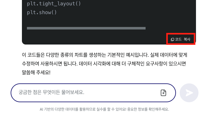 AI 첫걸음오 포텐스닷 채팅으로 생성한 코드 복사가 조금 더 편해졌네요!!점점검하는 논문 루키 코드 블럭 하단에도 코드 복사 버튼이 추가되었군요?! 긴 코드를 복사할 때도 좀 더 편해졌습니다!!